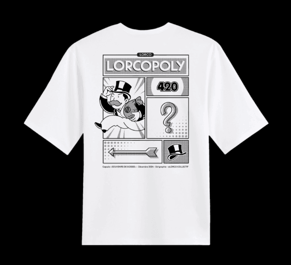 Revivez vos souvenirs d’enfance avec le t-shirt Lorcopoly, un clin d’œil au jeu culte Monopoly revisité avec un design fun et unique. Parfait pour un look original, cette pièce en série limitée saura séduire les fans de culture pop et de jeux iconiques !